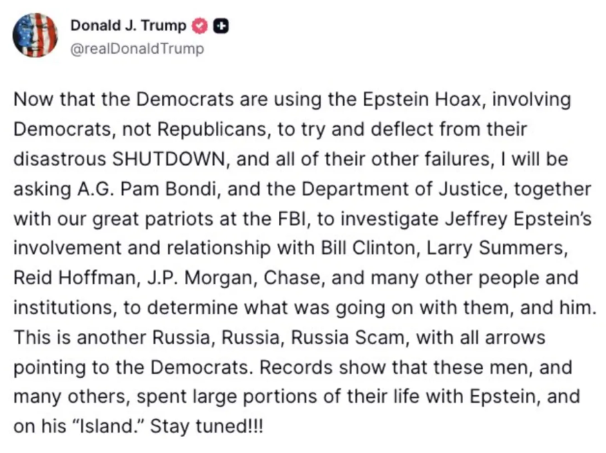 Twenty-four hours after House Speaker Mike Johnson announced an pending vote to “compel” the DOJ to release the Epstein files, President Trump shocked the world by demanding an investigation of people named in the Epstein disclosures, including (but not limited to) Bill Clinton, former Harvard President Larry Summers, billionaire Democrat donor Reid Hoffman, and mega-bank J.P. Morgan-Chase.