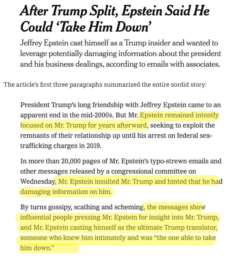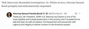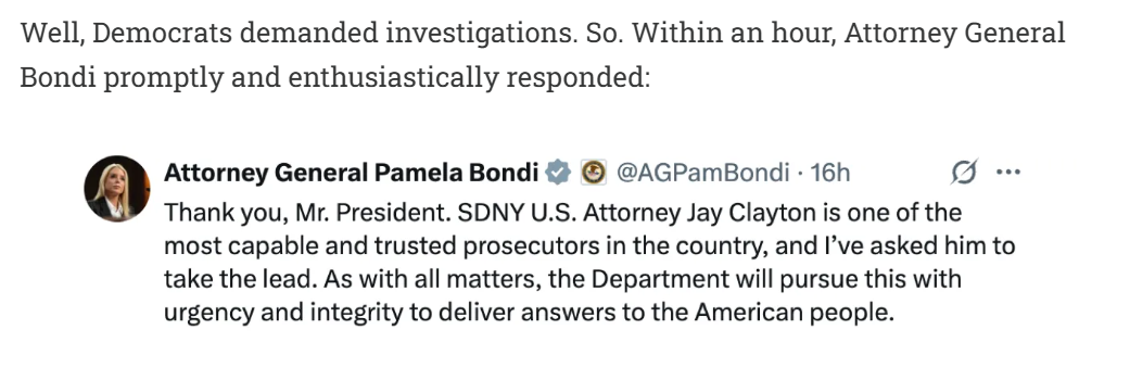 The Times never saw this coming. The article practically gasped with shock, angrily reminded readers about the DOJ’s unsigned July memo closing the investigation, and frantically speculated that Trump only opened these new investigations so DOJ would have an excuse not to turn over its Epstein files because of pending investigations.