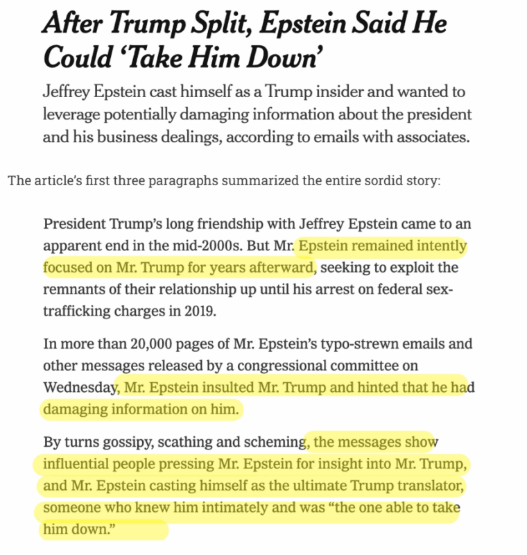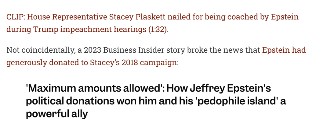 So far, the new documents have revealed media collaborating with Epstein against Trump (in yesterday’s post), a growing narrative in Epstein’s own sloppy words that he perceived Trump to be his Great Nemesis, and evidence that Epstein thus tried to destroy Trump by conspiring with media and House Democrats.