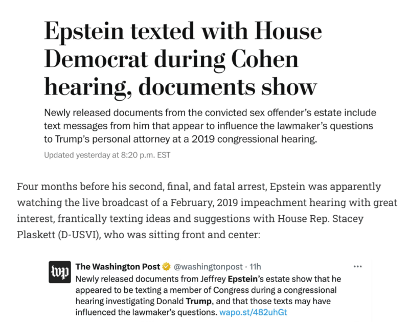 I’m not the only one saying it. Yesterday, after reviewing the latest Epstein documents, the Washington Post ran an astonishing story under this headline: