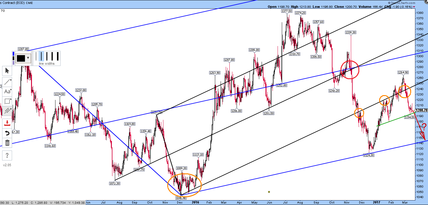 Bullish potential target: $1250 to resistance at bottom line of black pitchfork…