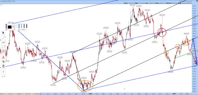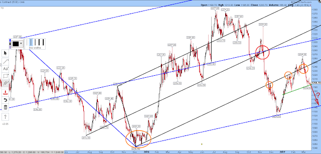 Bearish potential target: $1145 at bottom line of blue pitchfork…