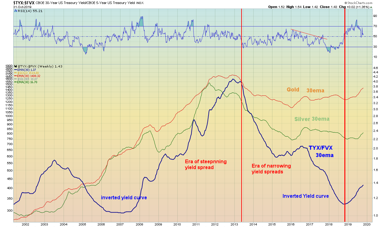 To eliminate the trading noise this chart compares weekly 30ema Gold, silver price with yield spread TYX/FVX from 2002 .