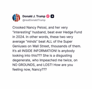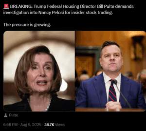 Isn’t an investigation of this a waste of time. Everyone knows she has been insider trading for decades but isn’t it “legal” for members of Congress? That is what should be investigated. Every law on the books should apply to EVERY US citizen with no exceptions and no exemptions. She should be investigated for J6 and not waste time on insider trading.
