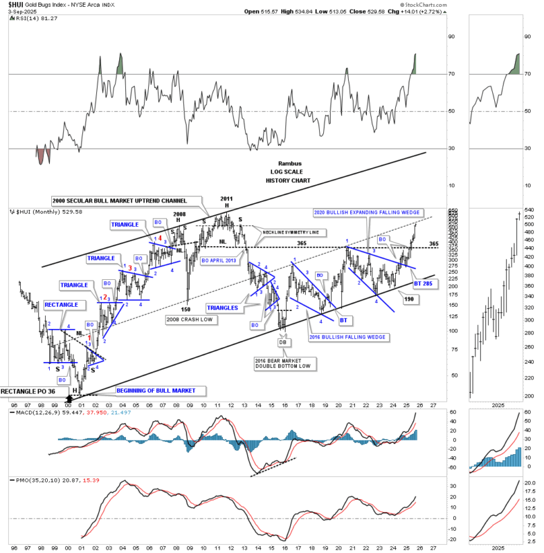 As the 2020 bullish expanding falling wedge is the largest consolidation pattern the HUI has ever built, then we can assume the impulse move will also be the largest in history. As you can see, when the top rail was backtested in January of this year at 285, it hasn’t looked back. The neckline extension line taken from the 2011 H&S top was resistance when the 2020 rally came to an end and the 2020 bullish expanding falling wedge began to form. This most recent rally took out the 2020 high after a short pause and has now reached the center dashed midline of the 2000 parallel secular bull market uptrend channel.