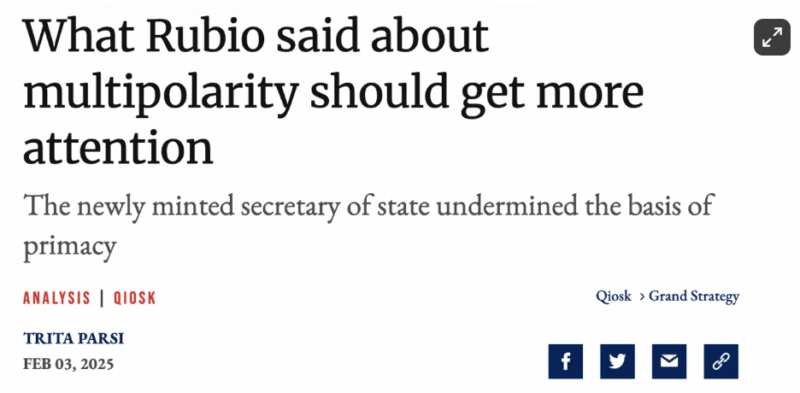 My ‘working hypothesis’ is not just based on this week’s current events. I’ve held this theory since early in Trump 2.0, and I could offer many other bits of circumstantial evidence. Maybe I first began considering this concept after hearing Marco Rubio’s comments, right after he assumed post as our new Secretary of State, and less than two weeks into Trump 2.0. Headline from Responsible Statecraft, February 3rd: