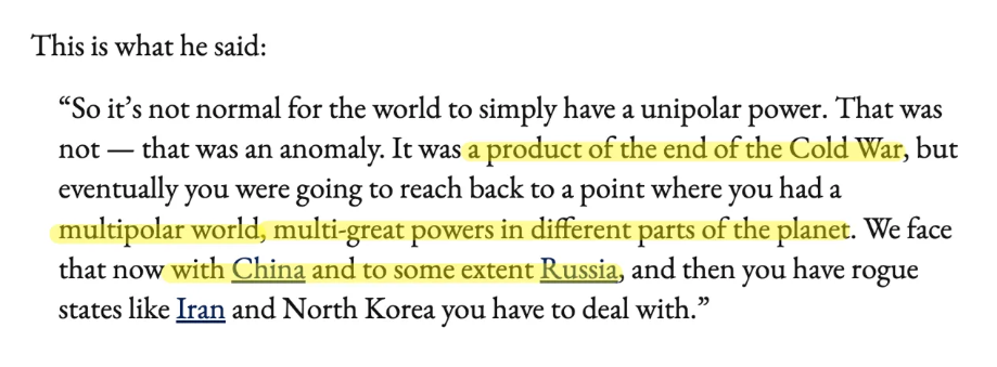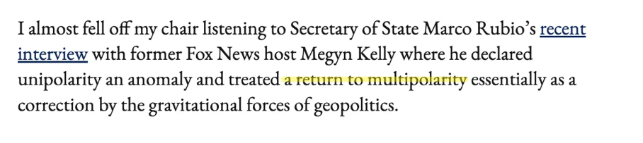 Rubio essentially described my map. He precisely framed the tri-polar world reconfiguration, not as an American retreat, but as historic realism. America doesn’t need to be everywhere, because multipolarity is the natural state of the world. And, I might add, it is a more stable state than an artificial global hegemony.