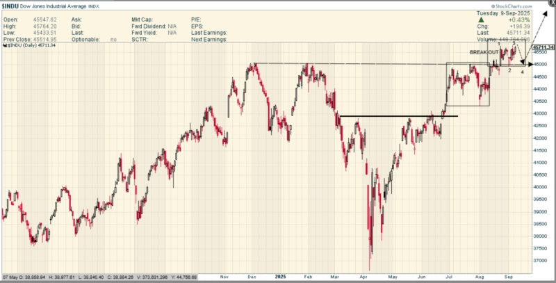 You may be right. I am still smarting from my gold chart because gold breached my top resistance so violently (much to my susprise). After thinking more about it though I recalled that we should be watching for an impending Dow/Gold Ratio of 2 or 3 coming up on this cycle. Damn! Of course gold breached and ran higher. It has to in order to get us to 5000 which is a number that might produce a reasonable figure for the ratio to come in at 2.