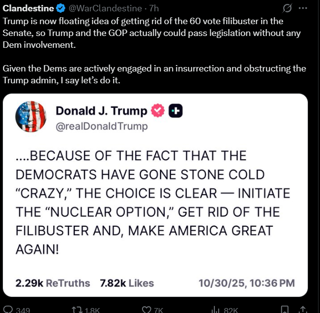 “That’s what you see with President Trump’s TRUTH post last night about the filibuster. We just want this to END!”