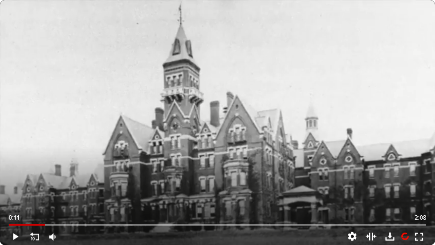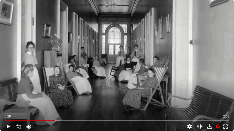 Just look at the height of the doorways in this photo. Its made for 10 foot tall men. And look how high up the door handle is on the right side of the photo. And how can we explain the high flying placement of the wall paintings in the hallway being a full heads height over the heads of the ladies in the photos. Yes, this was the home of a giant once. And we had taken it over to use as an asylum. Later the building was torn down. Its cavernous ceiling just too large a space to heat.