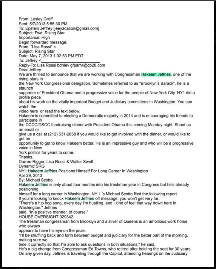 “Democrat fundraisers invited Epstein to an event or to meet privately with HAKEEM JEFFRIES as part of their 2013 effort to win a majority!”