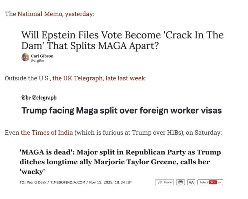 we must dismantle the latest narrative: that MAGA “is dying:” gleeful media superstorm about MAGA “rifts,” “splits,” and “crackups”; MTG versus Trump fued fuels discontent in base; Marjorie’s dashed senate hopes turns ally into enemy; the president’s litany of success; back to foreign worker visas, the evergreen complaint of MAGA critics; history of H1Bs; the only president who reduced H1B visa approvals; Laura Ingraham comments spark meltdowns; what Trump says versus what he does; encouragement versus criticism; and reality over democrat narratives.