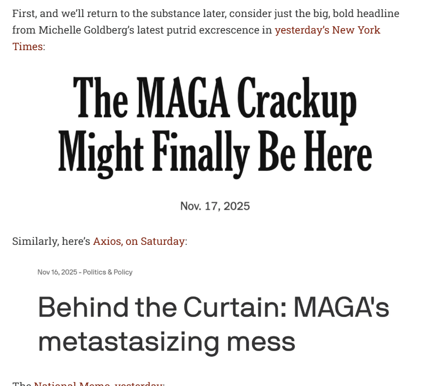 ? Fortunately, I do not think MAGA is crumbling, or fracturing, or dying, or whatever poisonous outcome corporate media is praying their journalistic spell-casting will produce. Not yet. But progressives and their deep state allies have seized on a narrative, and it is past time to snatch that narrative away from them.