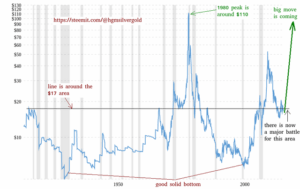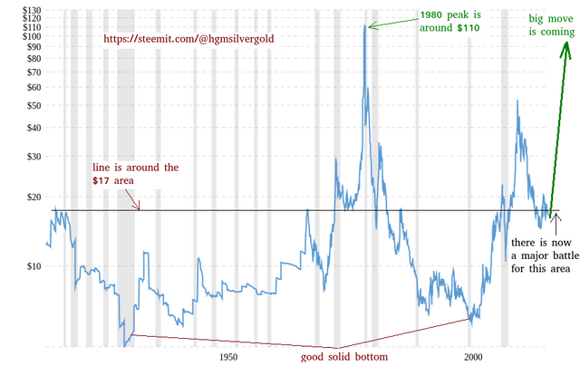 This chart a few years old, showing price of silver over the last 100 years. We are currently somewhere on the green line on the right.