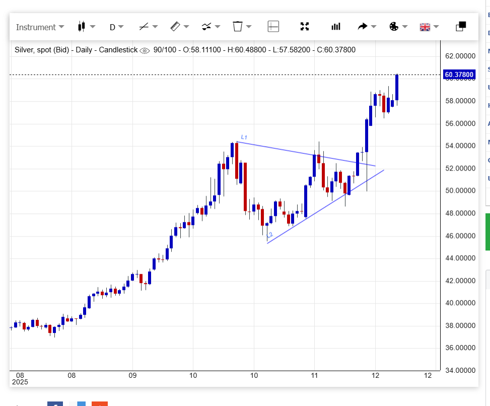 The high in 2011 was $49.51. Inflation adjusted, that’s $71.49. Am I thrilled with today’s Price action of course. I’ll post a Monthly chart for silver. The inverse had shoulder I have, shows the price objective of $80.