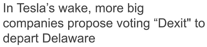According to that Reuters article, by this May, thirteen major U.S. billion-dollar corporations had either already voted to depart Delaware or had votes scheduled to approve such a move. The media took to calling it “Dexit,” which financial reporters thought was a very clever name but which never caught on with normal people, for some reason.