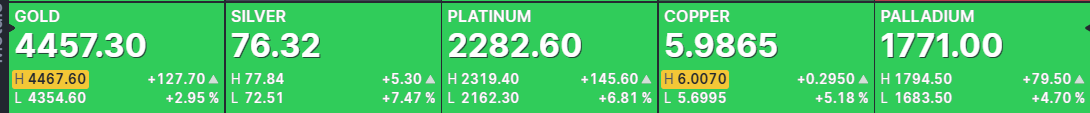 Great day, but a somewhat disappointing selloff of a few percentage points in the miners at the end. That was weird. Up a lot but still a few thousand shaved off at the end of some big names. I hope it will continue, but the miners are still being held back compared to the metals. We would have been FAR better off just investing in GLD and SLV. How did you do?