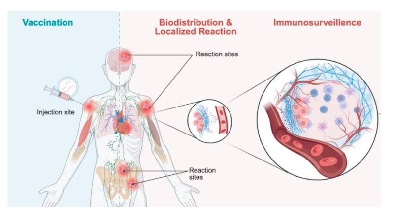 odd tumor clusters near injection sites or draining lymph nodes, and