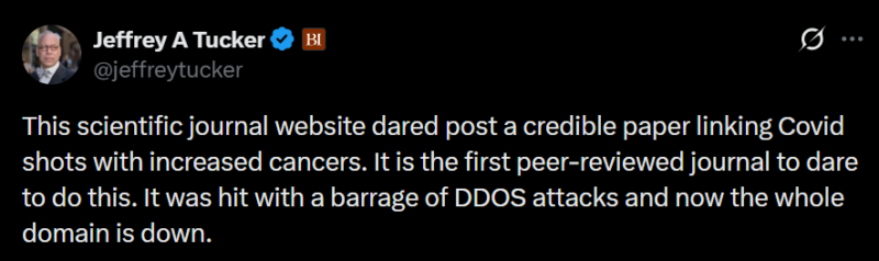 We’ve been waiting impatiently for five years now for someone with authority to say the obvious. But it’s done. Check it off the agenda paper. They’ve mapped it out in the careful language of the academy, and the Censorship Creature is on a rampage, doing whatever it can to stop the truth about the jabs from coming out. I’ll go out on a limb, and argue the only reasonable suspect for these ceaseless cyberattacks on an obscure cancer journal —attacks that began right after it published a damning study linking the covid jabs to a wide array of tumors— is Big Pharma.