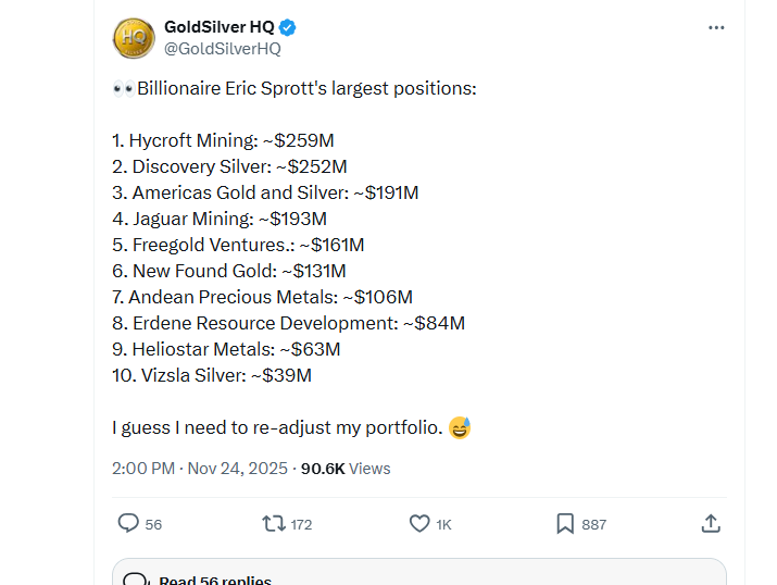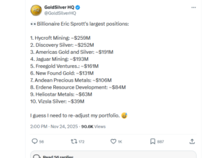 Here’s a snapshot of the largest precious-metals-related stock positions that Eric Sprott (through entities he beneficially owns) currently holds, based on recent insider ownership reports and portfolio summaries: