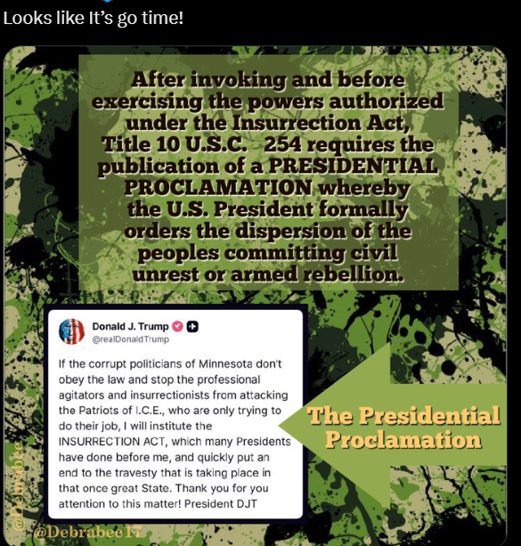 Trump is preparing to invoke the Insurrection Act so the US MIL can carry out arrests in Minneapolis, presumably related to the massive fraud scandal.
