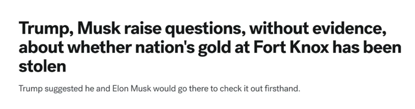 So that’s one dot on the board. Next, remember all the buzz right after Trump returned to office last year, when DOGE was still big news, about how he and Elon Musk wanted to “audit” Fort Knox? ABC, March 5th, 2025:
