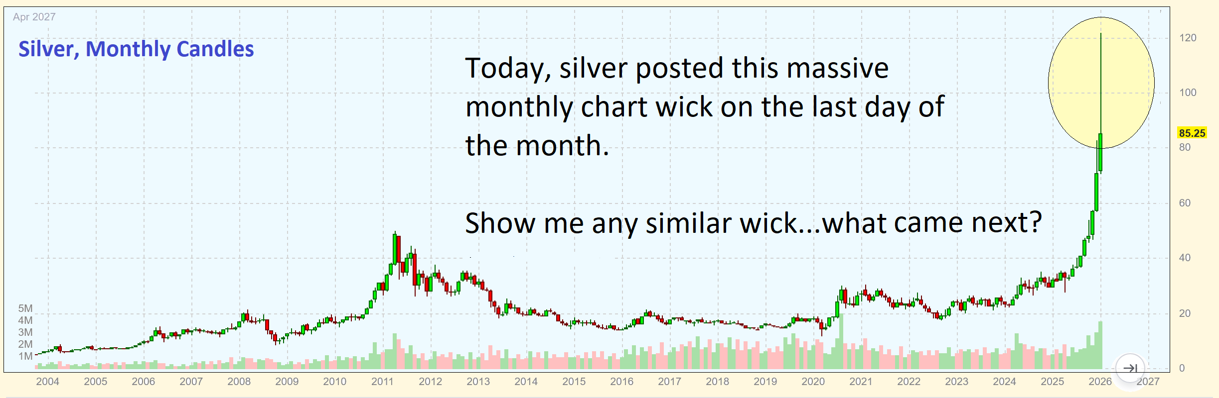 I see your wicks. I am not referring to just any wicks though but to wicks you only see when a trend gets terminated. Anyway I am not saying the silver bull is ended. Only that it may be stalled out for longer than others imagine. How many people rushed out and bought more silver or miners today? How many will be filling their boots with Calls come Monday? That candle gives me doubts. I know its not popular to say such things here. I am supposed to be rah, rah, rah for the team.
