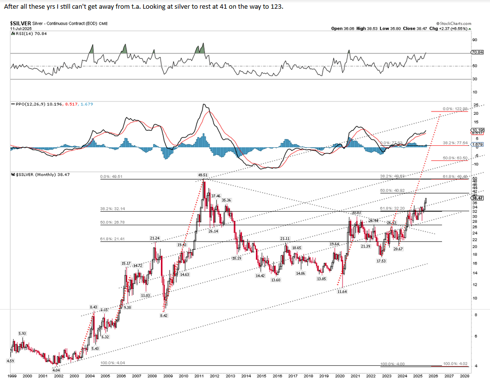 He sent me one of his Charts he did in mid 2025 with silver at about $40 which projected ( using trend lines AND Fibonacci Extensions ) to 123 by early 2026