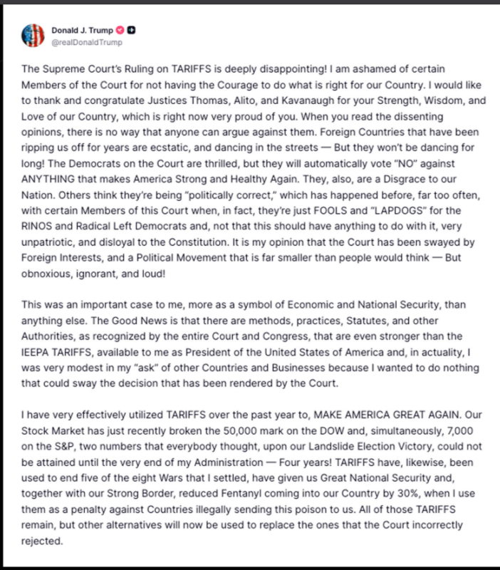 “Effective immediately, all National Security TARIFFS, Section 232 and existing Section 301 TARIFFS, remain in place, and in full force and effect. Today I will sign an Order to impose a 10% GLOBAL TARIFF, under Section 122, over and above our normal TARIFFS already being charged…” – President Donald J. Trump