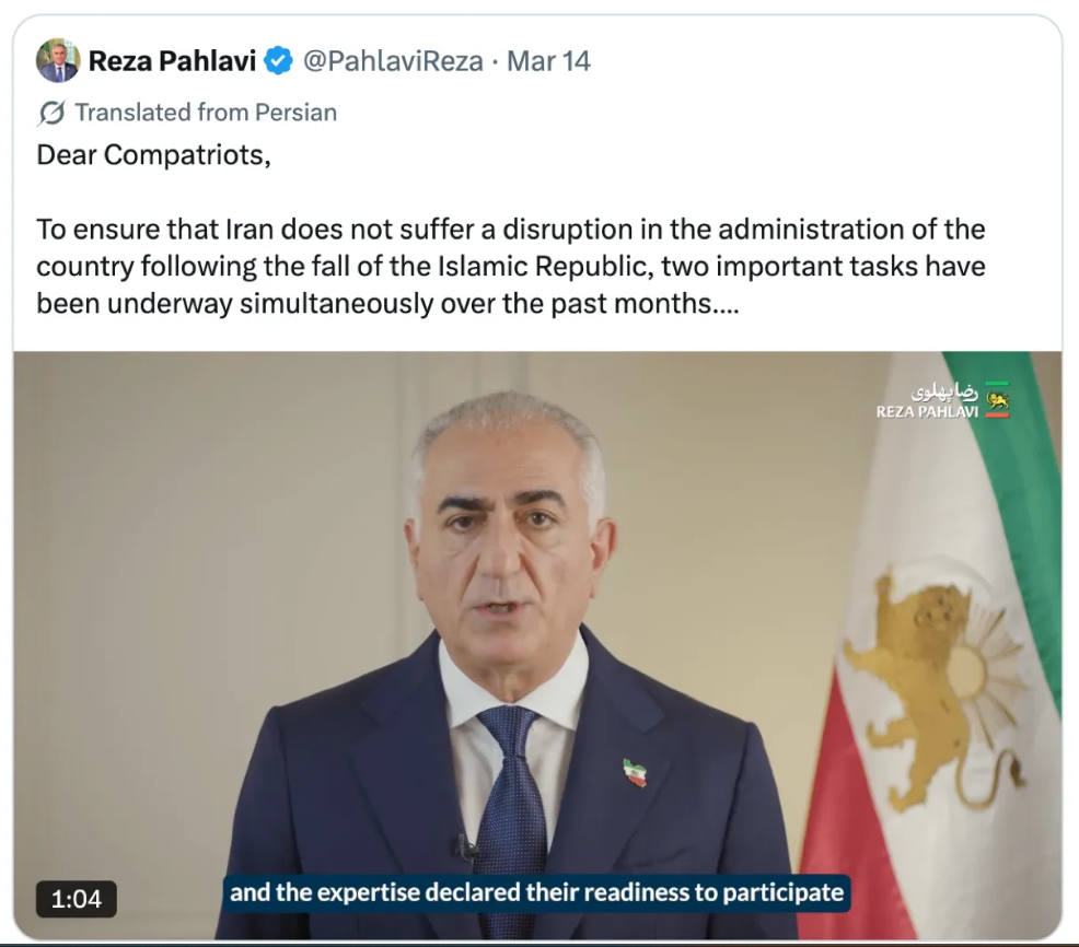 Pahlavi didn’t suddenly make this announcement because he’s feeling optimistic in general. Timing is everything. He’s announcing it now because people who know stuff are telling him the window may be opening. You don’t announce a detailed transition plan while the old regime is stable. You announce it when you think the transition is coming soon. Otherwise, you just expose the plan to criticism and counter-propaganda.