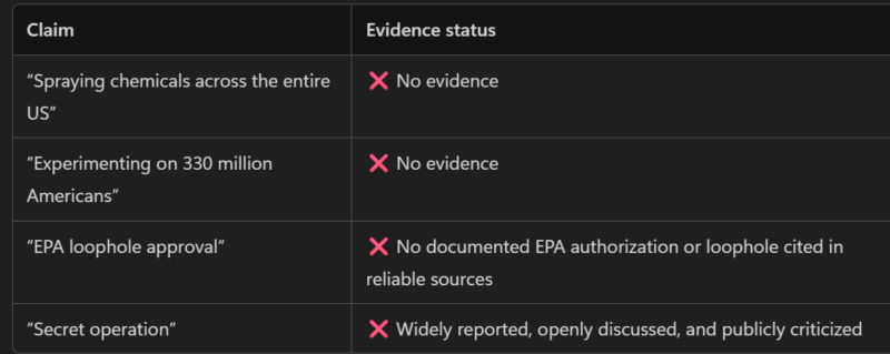 ClaimEvidence status“Spraying chemicals across the entire US”? No evidence“Experimenting on 330 million Americans”? No evidence“EPA loophole approval”? No documented EPA authorization or loophole cited in reliable sources“Secret operation”? Widely reported, openly discussed, and publicly criticized