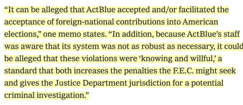 I told you to keep an eye on this story as the midterms got closer. It’s playing out just as I suspected. (Hey— my “rightness ratio” is stabilizing!) Yesterday, the New York Times ran a remarkable, long-form, 4,000-word exclusive exposé headlined, “ActBlue May Have Misled Congress on Vetting Foreign Donations, Its Lawyers Warned.” Oh, no!