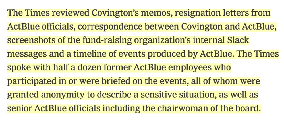 The reporter left no wiggle room for plausible denials. Legal memos, resignation letters, lawyer correspondence, internal Slack messages, and interviews with six former ActBlue employees, senior officials, and the chairwoman, plus a ‘timeline of events’ produced by ActBlue itself.