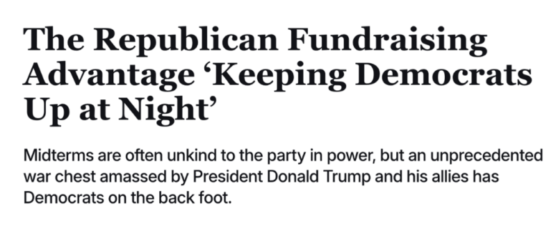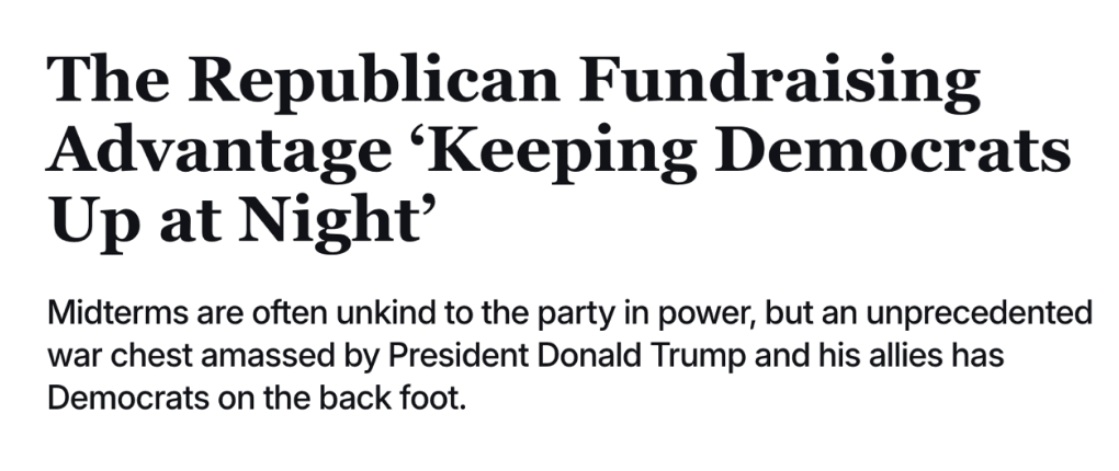 It’s the exact opposite of the situation the GOP faced during the Trump 1.0 midterms in 2018. Then, Democrats held the financial advantage, and Republicans lost 41 seats in the House. This time it’s the other way around. “Trump’s money advantage is one of the biggest differences from 2018,” said Jesse Ferguson, a veteran Democratic strategist. “And one of the biggest things that should be keeping Democrats up at night.”