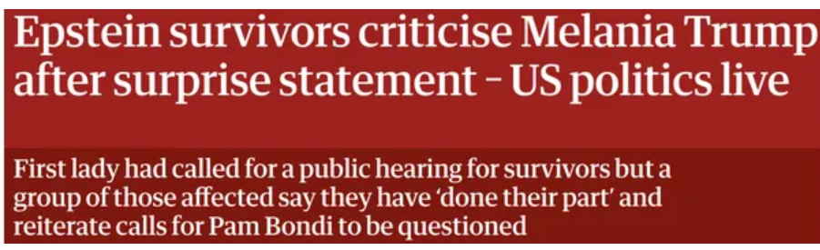 It was exactly what the “survivor groups” have been demanding. Time on the record before Congress. Representative Ayanna Pressley (D-MA) has long demanded Congressional hearings with survivors. She’s been pushing the House Oversight Committee to hold exactly the kind of hearing Melania just called for. But after Melania’s statement, an anonymous group of “survivors” immediately pivoted to saying they don’t want to testify. Yesterday’s Guardian headline:
