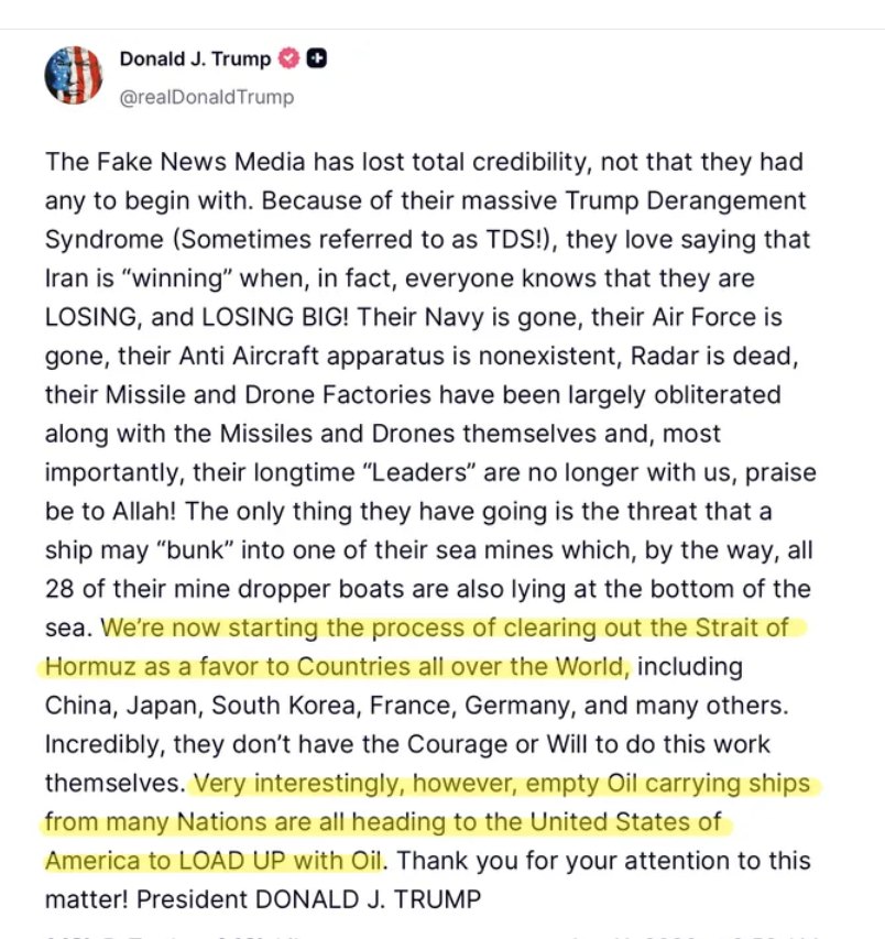 “We’ve now started the process of clearing (mines) out (of) the Strait of Hormuz as a favor to Countries all over the World,” the President said. Clearing them slowly. Now consider his very next sentence: “Very interestingly, however, empty Oil carrying ships from many Nations are all heading to the United States of America to LOAD UP with Oil.” In other words, the US benefits from the mines. It couldn’t be clearer.