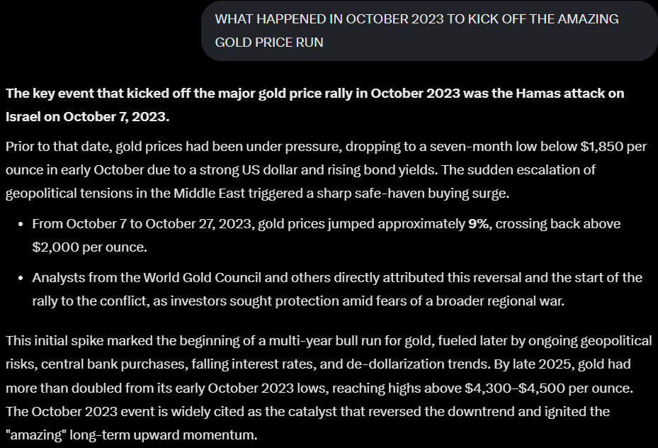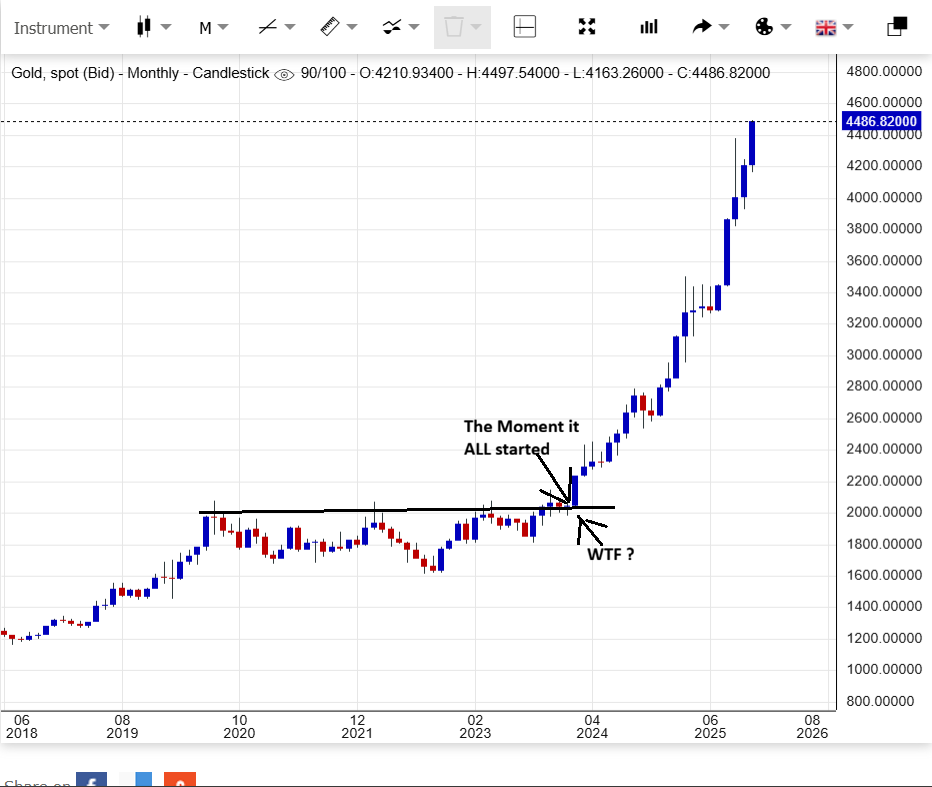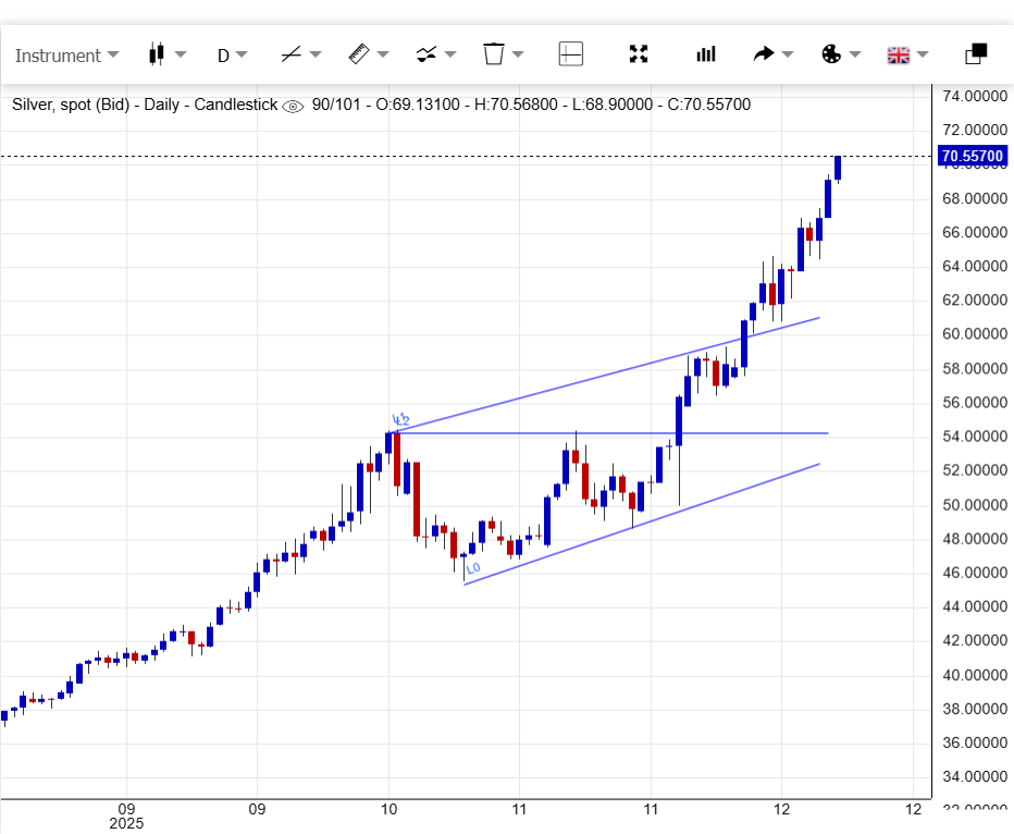 As expected, Gold has broken out to new ATH’s and has now reached $4,500.(close enough as of this writing) Only six US trading sessions left,(counting today’s) to reach my “symmetrical suggestion” target of $5,000 on New Years Eve. What could cause Gold to rise so sharply, in such a short period of time? Well, as I suggested in a recent post, if Silver goes bonkers(even more so than it already has, and the COMEX goes to SELL only mode, as with the Hunt brothers, Gold becomes the only game in town, and that would provide the fuel for it to rocket to $5000 (and beyond) in very short order. While ambitious for sure, not as much so, as when I first made the call. If reached, it would cap a fantastic precious metals year and present the likelihood of another outstanding, precious metals year in 2026. PS: If that happens, Silver will likely experience a sharp decline for it’s phony, paper Comex spot price, while you will find it hard to buy physical metal at those posted levels.