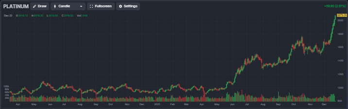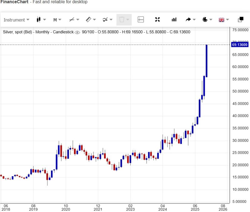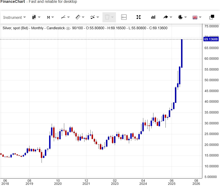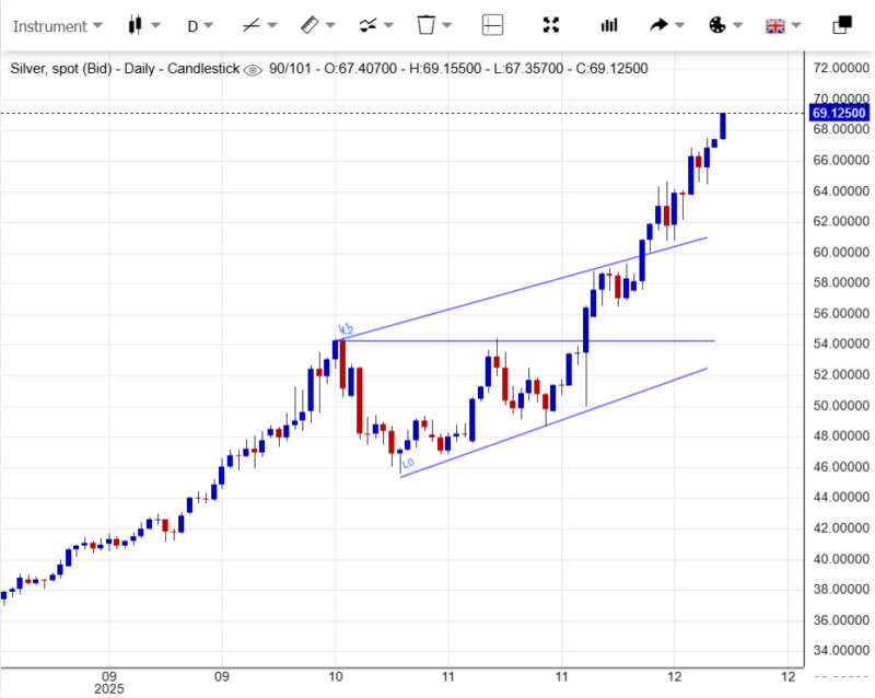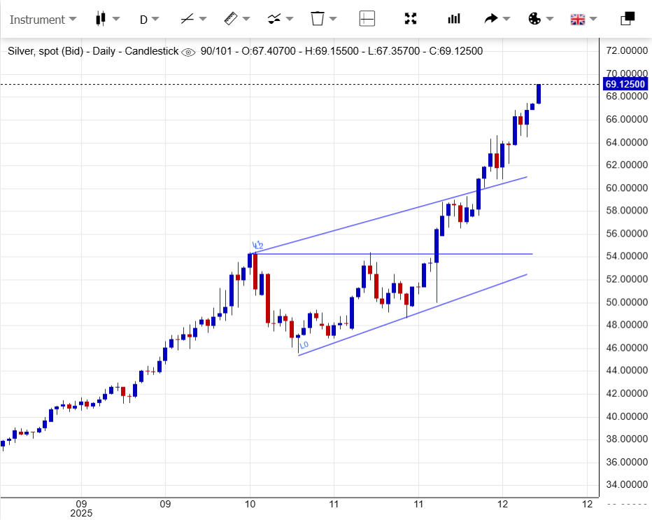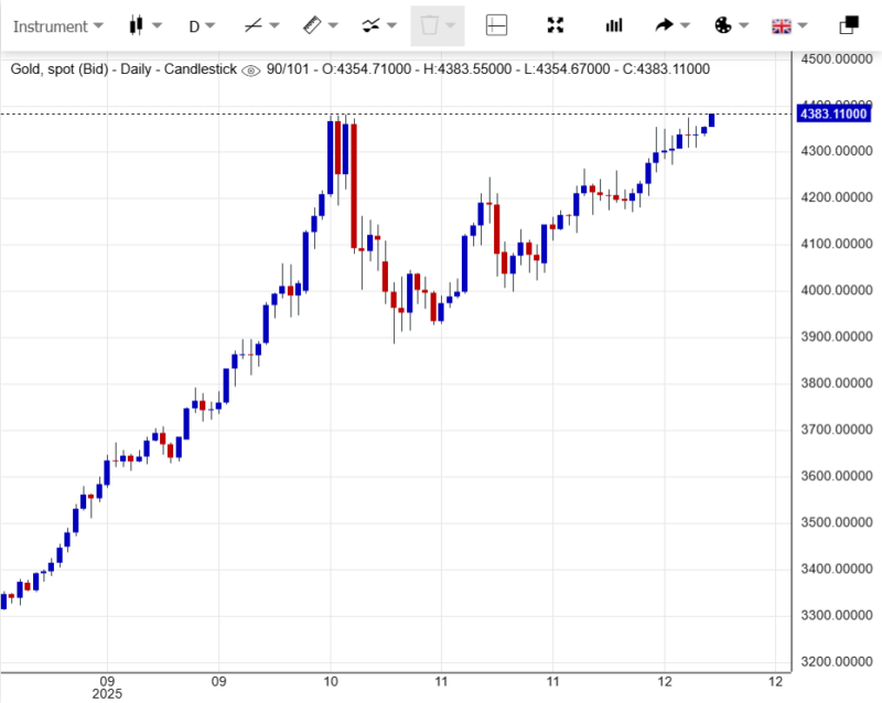 As expected, Gold has broken out to new ATH’s and has now reached $4,500.(close enough as of this writing) Only six US trading sessions left,(counting today’s) to reach my “symmetrical suggestion” target of $5,000 on New Years Eve. What could cause Gold to rise so sharply, in such a short period of time? Well, as I suggested in a recent post, if Silver goes bonkers(even more so than it already has, and the COMEX goes to SELL only mode, as with the Hunt brothers, Gold becomes the only game in town, and that would provide the fuel for it to rocket to $5000 (and beyond) in very short order. While ambitious for sure, not as much so, as when I first made the call. If reached, it would cap a fantastic precious metals year and present the likelihood of another outstanding, precious metals year in 2026. PS: If that happens, Silver will likely experience a sharp decline for it’s phony, paper Comex spot price, while you will find it hard to buy physical metal at those posted levels.